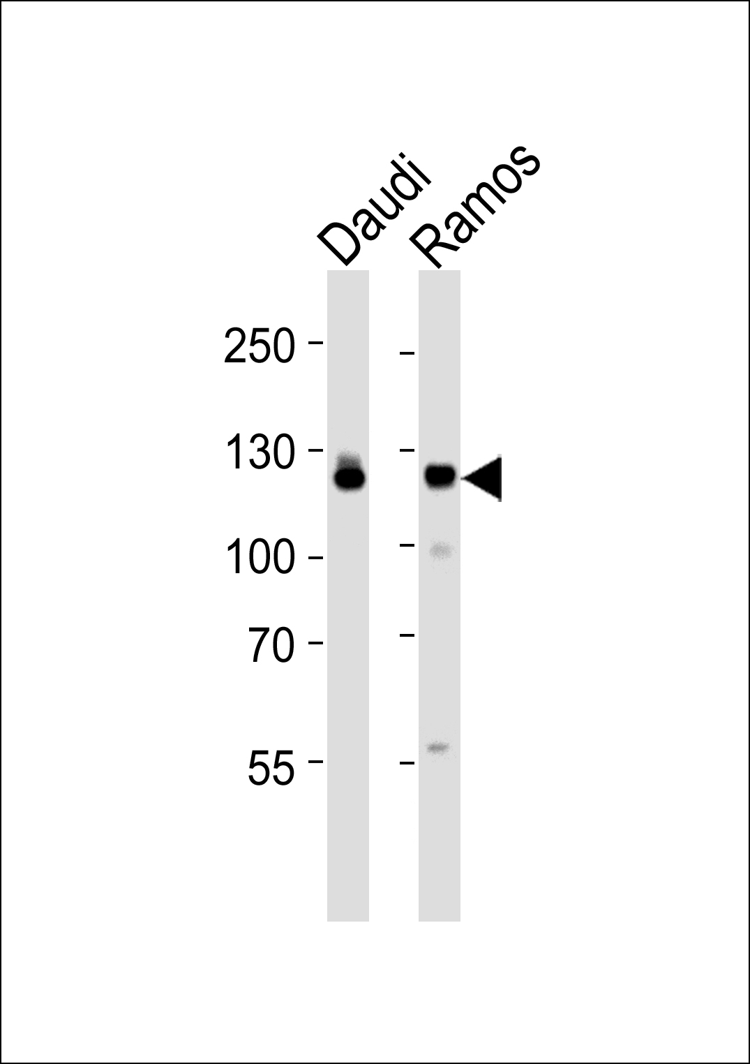 Western blot analysis of lysates from Daudi, Ramos cell line (from left to right), using PTK2B Antibody (C-term)( AMR09636G). AMR09636G was diluted at 1:1000 at each lane. A goat anti-rabbit IgG H&L(HRP) at 1:5000 dilution was used as the secondary antibody. Lysates at 35ug per lane. |