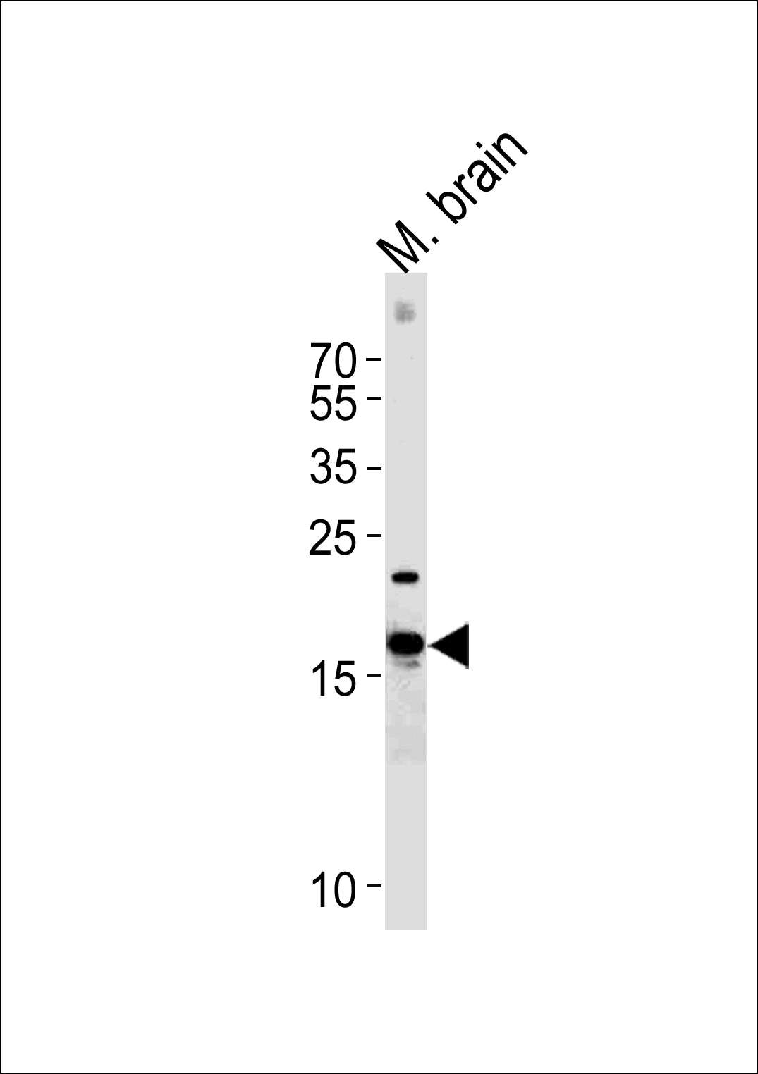 Western blot analysis of lysate from mouse brain tissue, using CPLX2 Antibody (Center)( APR11654G). APR11654G was diluted at 1:1000. A goat anti-rabbit IgG H&L(HRP) at 1:5000 dilution was used as the secondary antibody. Lysate at 35ug. |