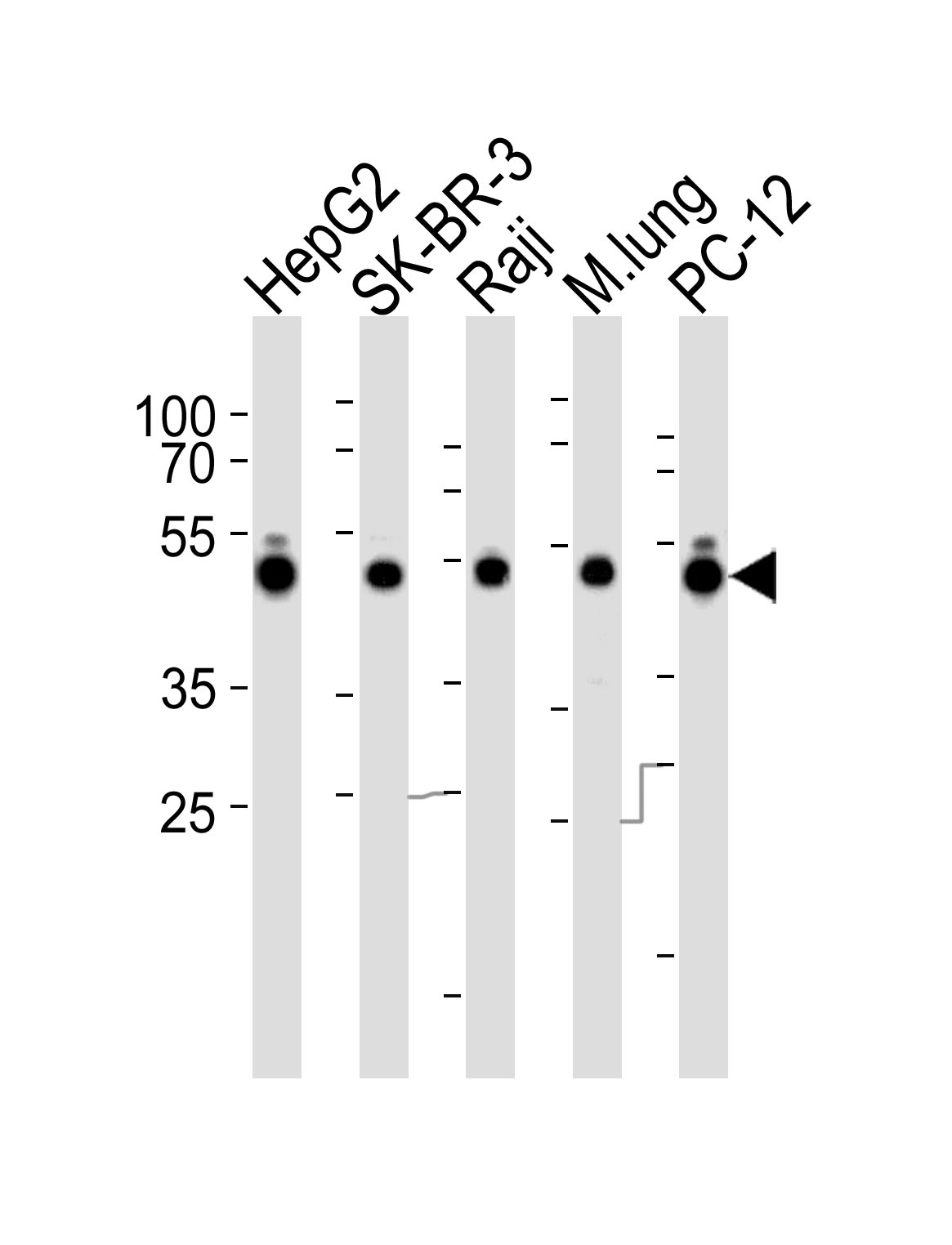 Western blot analysis of lysates from HepG2, SK-BR-3, Raji cell line, mouse lung tissue lysate and rat PC-12 cell line (from left to right), using DNAJA1 Antibody (C-term)( APR15757G). APR15757G was diluted at 1:1000 at each lane. A goat anti-rabbit IgG H&L(HRP) at 1:5000 dilution was used as the secondary antibody. Lysates at 35ug per lane. |