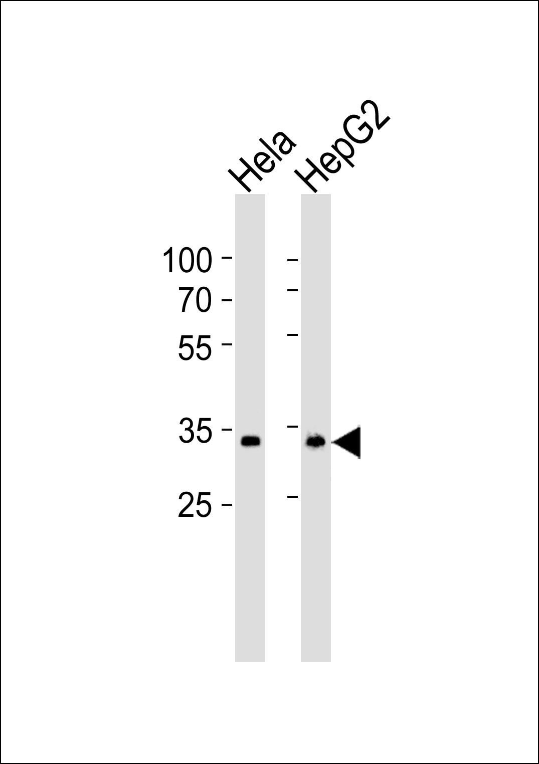 Western blot analysis of lysates from Hela, HepG2 cell line (from left to right), using MT-ND1 Antibody (N-term)( APR08560G). APR08560G was diluted at 1:1000 at each lane. A goat anti-rabbit IgG H&L(HRP) at 1:5000 dilution was used as the secondary antibody. Lysates at 35ug per lane. |