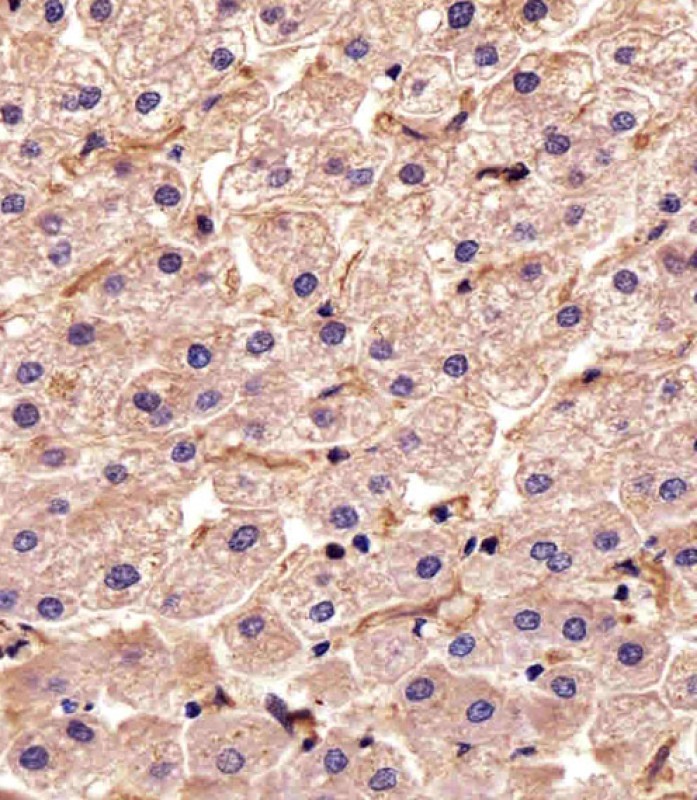 Immunohistochemical analysis of paraffin-embedded H. liver section using STMN2 Antibody (N-term)( APR13583G). APR13583G was diluted at 1:25 dilution. A undiluted biotinylated goat polyvalent antibody was used as the secondary, followed by DAB staining.