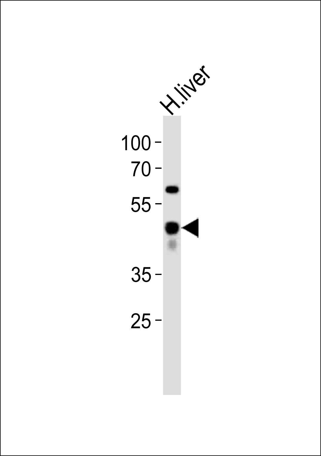 Western blot analysis of lysate from human liver tissue, using SERPINE1 Antibody (C-term)( AMR09882G). AMR09882G was diluted at 1:1000. A goat anti-rabbit IgG H&L(HRP) at 1:10000 dilution was used as the secondary antibody. Lysate at 20ug. |