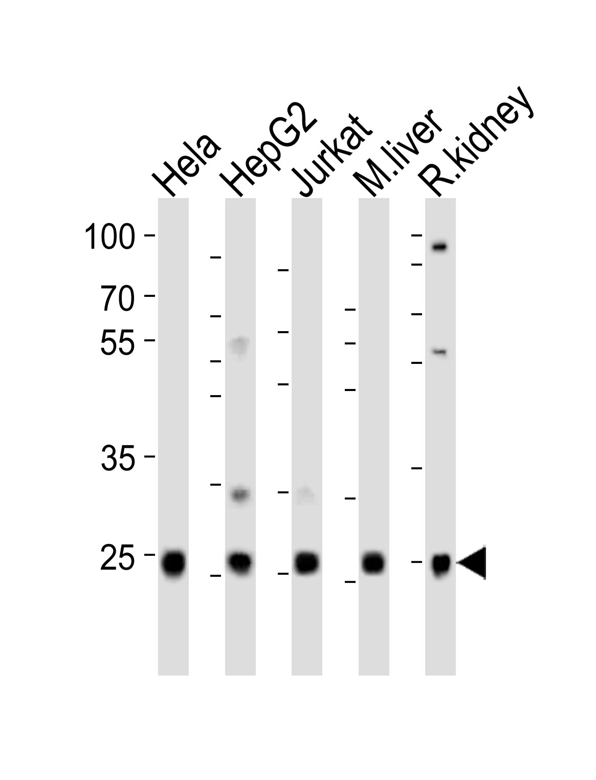 Western blot analysis of lysates from Hela, HepG2, Jurkat cell line, mouse liver, rat kidney tissue(from left to right), using UBB(Ubiquitin) Antibody (N-term)( APR11236G). APR11236G was diluted at 1:1000 at each lane. A goat anti-rabbit IgG H&L(HRP) at 1:10000 dilution was used as the secondary antibody. Lysates at 20ug per lane. |