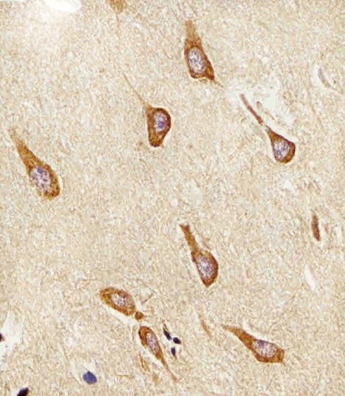 Immunohistochemical analysis of paraffin-embedded H. brain section using PAFAH1B1 Antibody (N-term)( APR12705G). APR12705G was diluted at 1:25 dilution. A undiluted biotinylated goat polyvalent antibody was used as the secondary, followed by DAB staining.