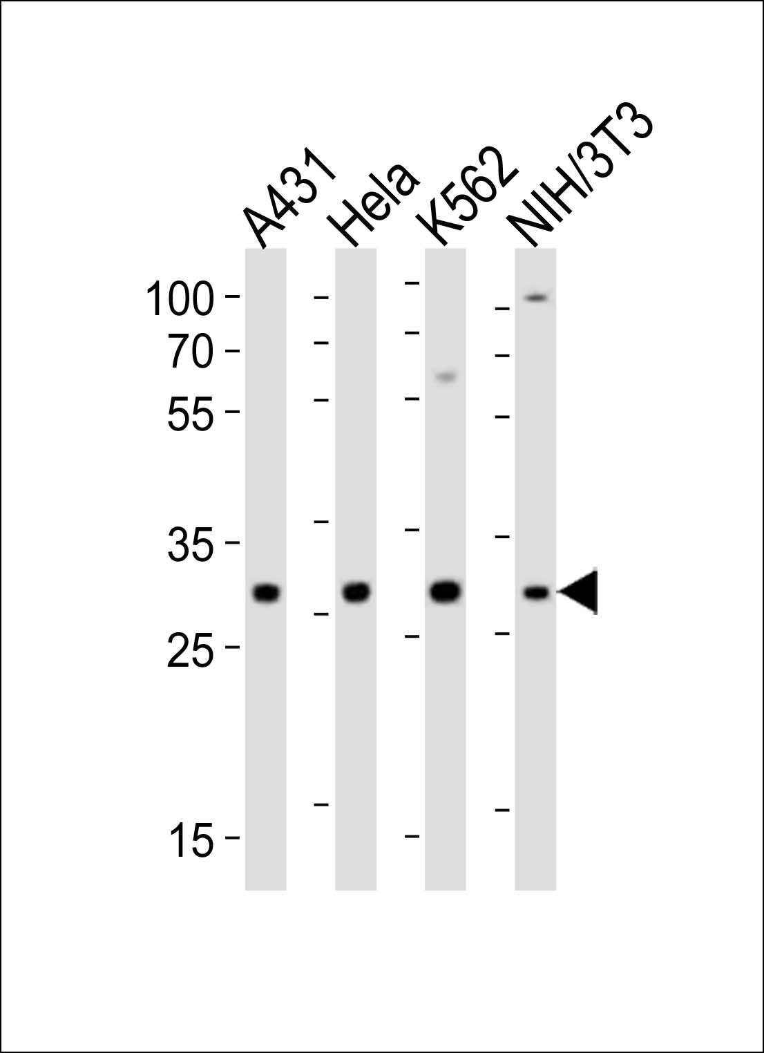 Western blot analysis of lysates from A431, Hela, K562, mouse NIH/3T3 cell line (from left to right), using CDK5 Antibody (C-term)( APG02518G). APG02518G was diluted at 1:1000 at each lane. A goat anti-rabbit IgG H&L(HRP) at 1:10000 dilution was used as the secondary antibody. Lysates at 20ug per lane. |