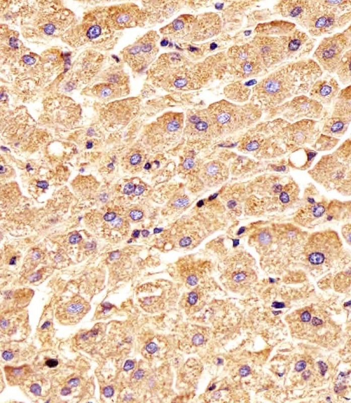 Immunohistochemical analysis of paraffin-embedded H. liver section using TYK2 Antibody (C-term)( AMM08407G). AMM08407G was diluted at 1:25 dilution. A undiluted biotinylated goat polyvalent antibody was used as the secondary, followed by DAB staining.