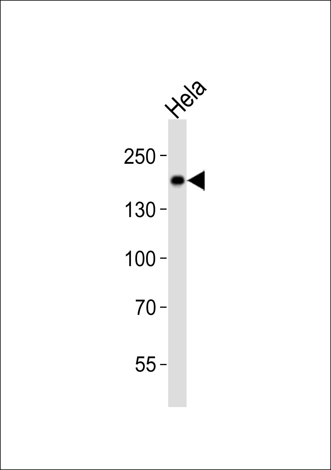 Western blot analysis of lysate from Hela cell line, using TYK2 Antibody (C-term)( AMM08407G). AMM08407G was diluted at 1:1000. A goat anti-rabbit IgG H&L(HRP) at 1:10000 dilution was used as the secondary antibody. Lysate at 20ug. |