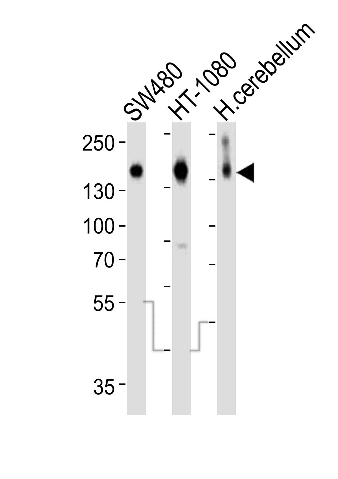 Western blot analysis of lysates from SW480, HT-1080 cell line and human cerebellum tissue(from left to right), using NCAM1 Antibody (C-term)( AMM06554G). AMM06554G was diluted at 1:1000 at each lane. A goat anti-rabbit IgG H&L(HRP) at 1:10000 dilution was used as the secondary antibody. Lysates at 20ug per lane. |