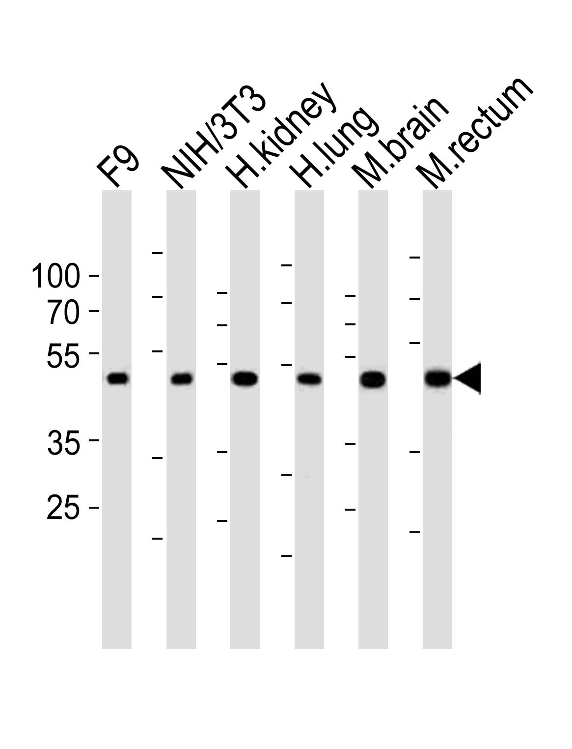 Western blot analysis of lysates from mouse F9, mouse NIH/3T3 cell line, human kidney, human lung, mouse brain, mouse rectum tissue (from left to right), using IHH Antibody (C-term)( APR16811G). APR16811G was diluted at 1:1000 at each lane. A goat anti-rabbit IgG H&L(HRP) at 1:10000 dilution was used as the secondary antibody. Lysates at 20ug per lane. |