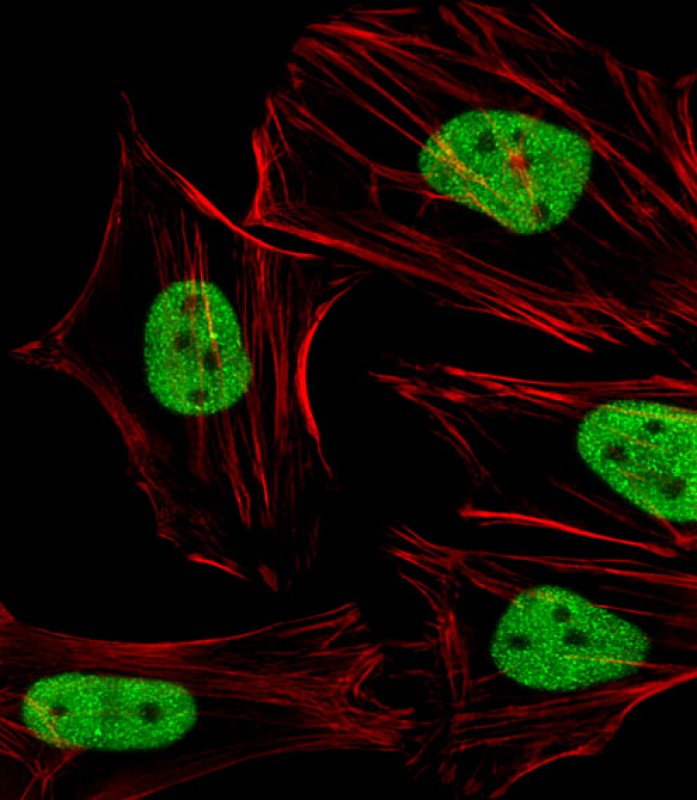Immunofluorescent analysis of 4% paraformaldehyde-fixed, 0. 1% Triton X-100 permeabilized Hela (Human Cervical epithelial adenocarcinoma cell line) cells labeling STAT5A with APR10277G at 1/25 dilution, followed by Alexa Fluor 488-conjugated goat anti-rabbit IgG (1583138) secondary antibody at 1/400 dilution (green). Confocal image showing nuclear staining on Hela cell line. Cytoplasmic actin is detected with Alexa Fluor? 555 conjugated with Phalloidin (OB16636430) at 1/100 dilution (red).
