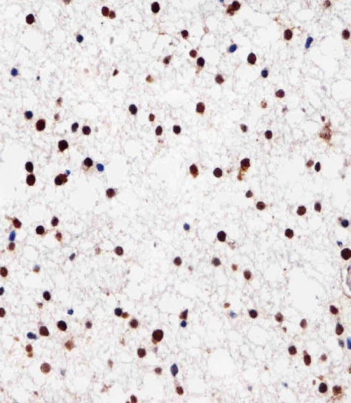 Immunohistochemical analysis of paraffin-embedded H. astroglioma section using NOVA1 Antibody (Center)( AMM06761G). AMM06761G was diluted at 1:25 dilution. A undiluted biotinylated goat polyvalent antibody was used as the secondary, followed by DAB staining.