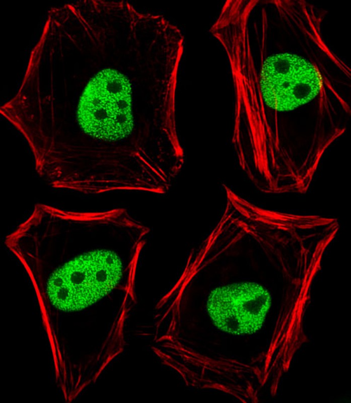 Fluorescent image of Hela cells stained with TLE1 Antibody (N-term)( AMM08214G). AMM08214G was diluted at 1:25 dilution. An Alexa Fluor 488-conjugated goat anti-rabbit lgG at 1:400 dilution was used as the secondary antibody (green). Cytoplasmic actin was counterstained with Alexa Fluor? 555 conjugated with Phalloidin (red).