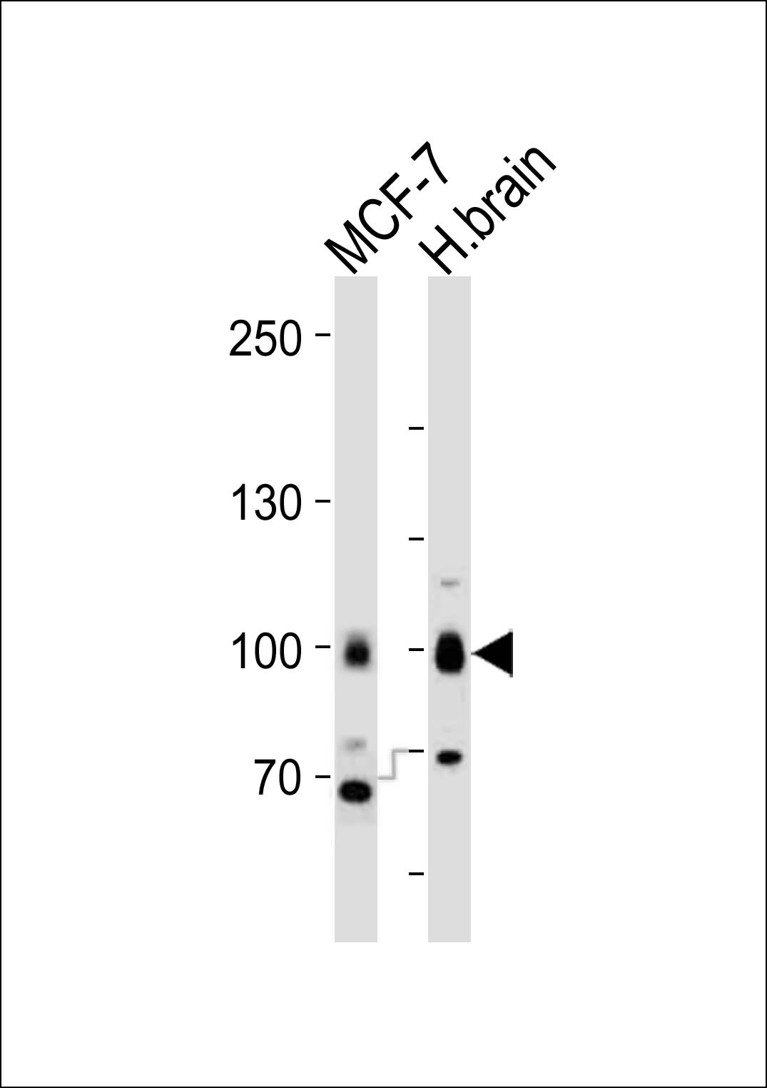 Western blot analysis of lysates from MCF-7, H.brain cell line (from left to right), using TLE1 Antibody (N-term)( AMM08214G). AMM08214G was diluted at 1:1000 at each lane. A goat anti-rabbit IgG H&L(HRP) at 1:10000 dilution was used as the secondary antibody. Lysates at 20ug per lane. |