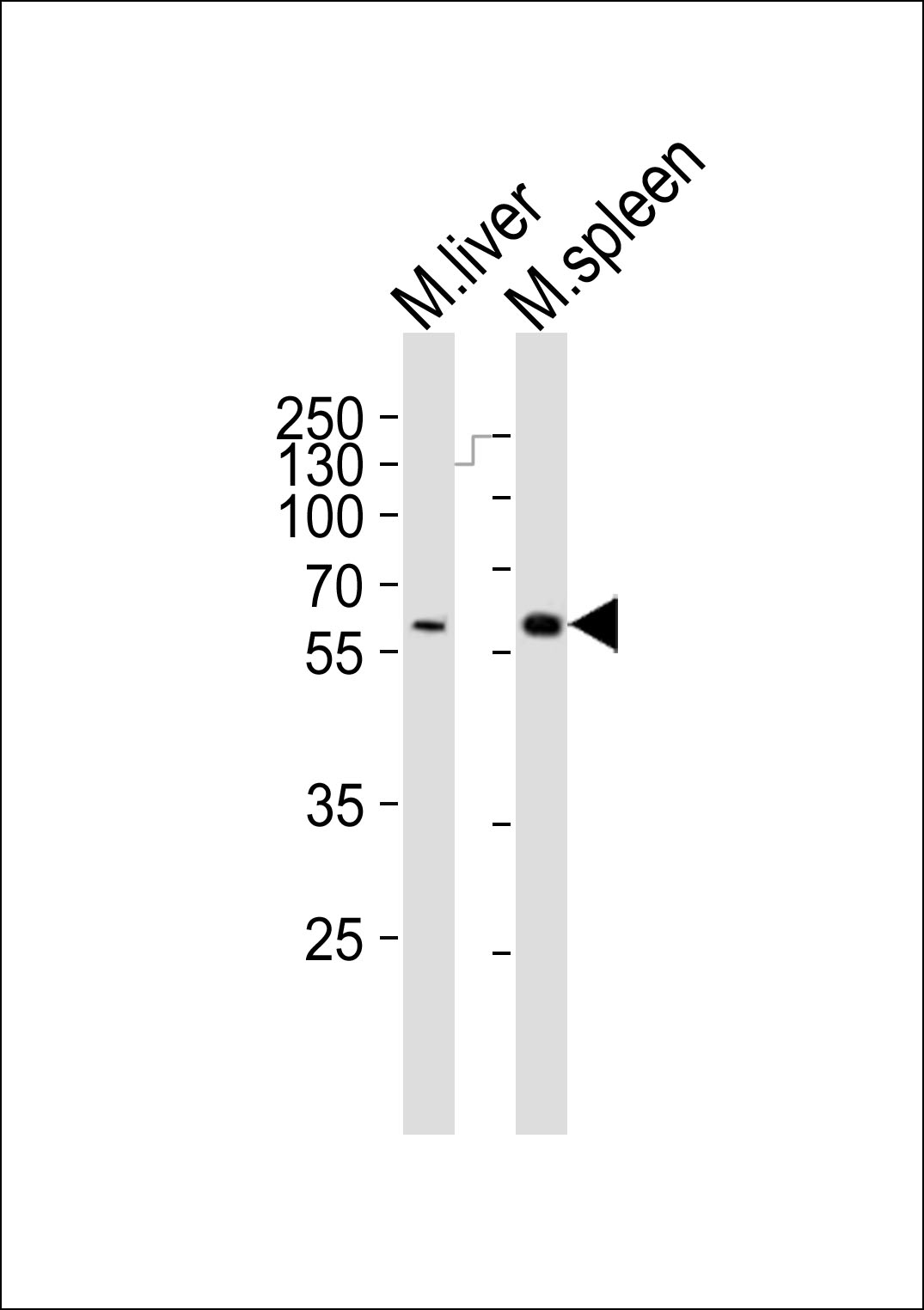 Western blot analysis of lysates from mouse liver, mouse spleen tissue lysate (from left to right), using Srms Antibody (Center)( APR17448G). APR17448G was diluted at 1:1000 at each lane. A goat anti-rabbit IgG H&L(HRP) at 1:10000 dilution was used as the secondary antibody. Lysates at 20ug per lane. |