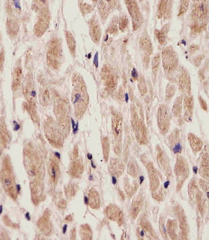 APG01585G staining ADORA2A in Human heart tissue sections by Immunohistochemistry (IHC-P - paraformaldehyde-fixed, paraffin-embedded sections). Tissue was fixed with formaldehyde and blocked with 3% BSA for 0. 5 hour at room temperature; antigen retrieval was by heat mediation with a citrate buffer (pH6). Samples were incubated with primary antibody (1/25) for 1 hours at 37°C. A undiluted biotinylated goat polyvalent antibody was used as the secondary antibody.