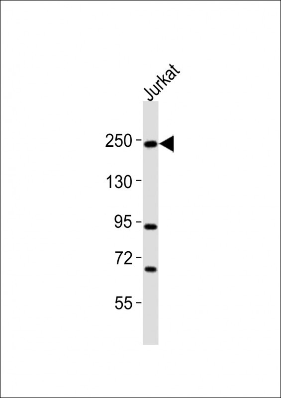 Anti-DOCK2 Antibody (C-term)at 1:2000 dilution + Jurkat whole cell lysates Lysates/proteins at 20 μg per lane. Secondary Goat Anti-Rabbit IgG, (H+L), Peroxidase conjugated at 1/10000 dilution Predicted band size : 212 kDa Blocking/Dilution buffer: 5% NFDM/TBST.