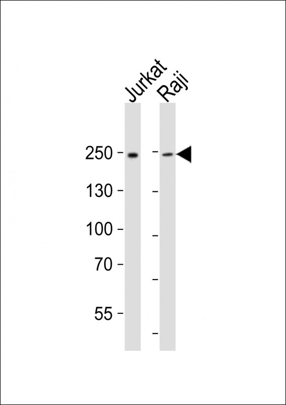 Western blot analysis of lysates from Jurkat, Raji cell line (from left to right), using DOCK2 Antibody (C-term)( APR15796G). A goat anti-rabbit IgG H&L(HRP) at 1:10000 dilution was used as the secondary antibody. Lysates at 20ug per lane. |