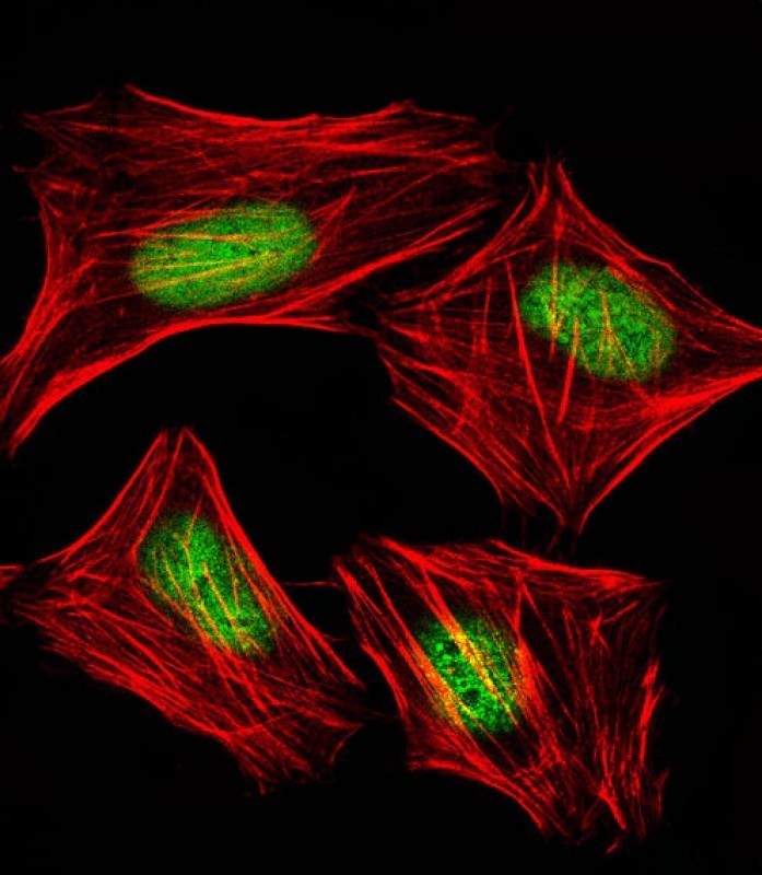 Immunofluorescent analysis of 4% paraformaldehyde-fixed, 0. 1% Triton X-100 permeabilized Hela (Human Cervical epithelial adenocarcinoma cell line) cells labeling Pdx1 with APR17830G at 1/25 dilution, followed by Dylight? 488-conjugated goat anti-rabbit IgG (NK179883) secondary antibody at 1/200 dilution (green). Immunofluorescence image showing nucleus staining on Hela cell line. Cytoplasmic actin is detected with Dylight? 554 Phalloidin (PD18466410) at 1/100 dilution (red).