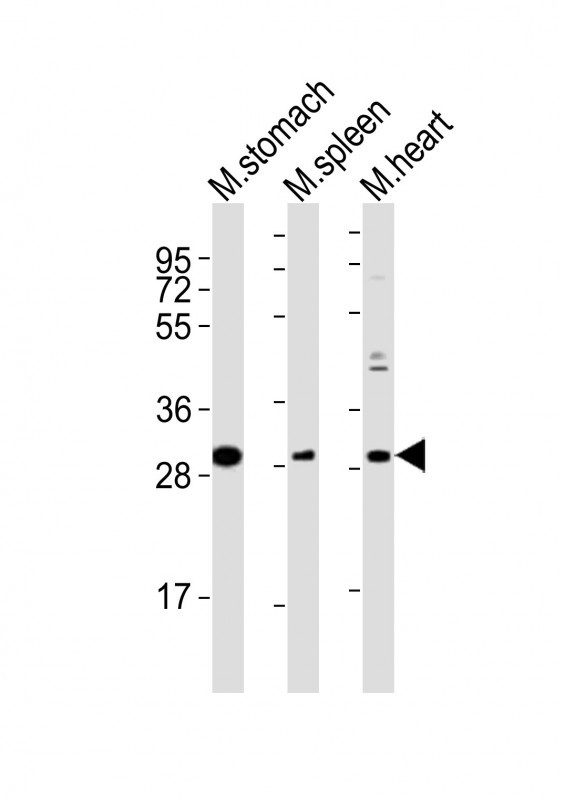 All lanes : Anti-Nkx2-5 Antibody (Center) at 1:2000 dilution Lane 1: mouse stomach lysates Lane 2: mouse spleen lysates Lane 3: mouse heart lysates Lysates/proteins at 20 μg per lane. Secondary Goat Anti-Rabbit IgG, (H+L), Peroxidase conjugated at 1/10000 dilution Predicted band size : 34 kDa Blocking/Dilution buffer: 5% NFDM/TBST. |