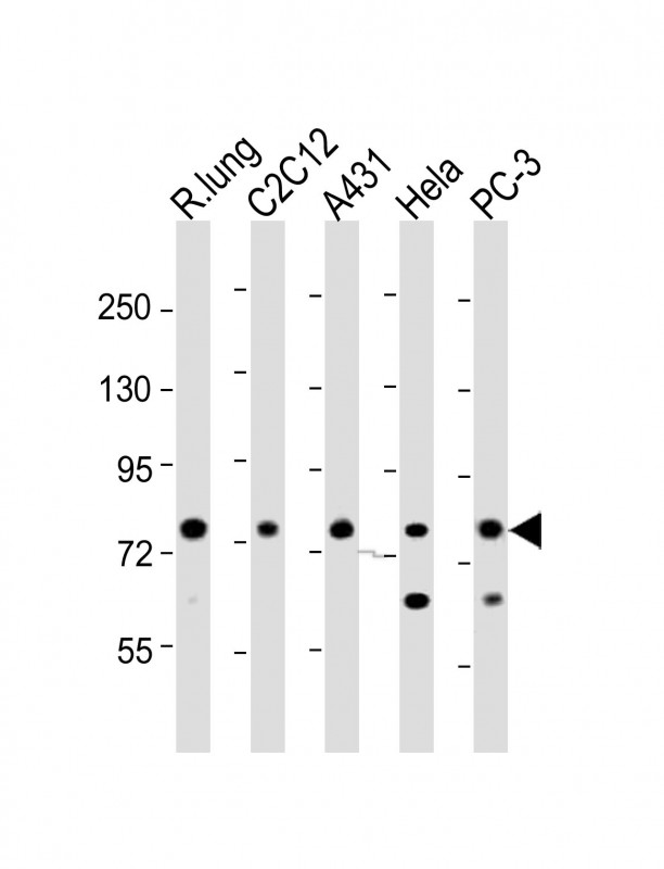 All lanes : Anti-CAPN2 Antibody (N-Term) at 1:8000 dilution Lane 1: rat lung lysates Lane 2: C2C12 whole cell lysates Lane 3: A431 whole cell lysates Lane 4: Hela whole cell lysates Lane 5: PC-3 whole cell lysates Lysates/proteins at 20 μg per lane. Secondary Goat Anti-Rabbit IgG, (H+L), Peroxidase conjugated at 1/10000 dilution Predicted band size : 80 kDa Blocking/Dilution buffer: 5% NFDM/TBST. |