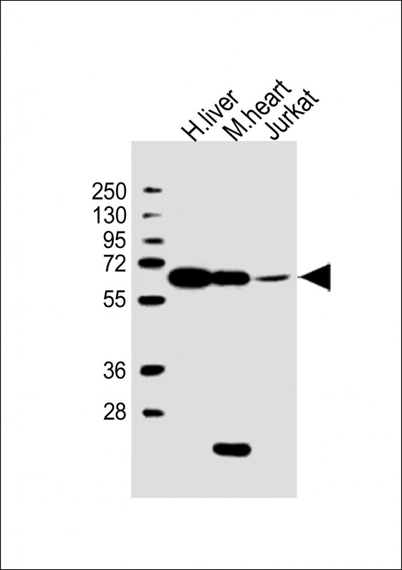 All lanes : Anti-PGM1 Antibody (C-Term) at 1:2000 dilution Lane 1: human liver lysate Lane 2: mouse heart lysate Lane 3: Jurkat whole cell lysate Lysates/proteins at 20 μg per lane. Secondary Goat Anti-Rabbit IgG, (H+L), Peroxidase conjugated at 1/10000 dilution. Predicted band size : 61 kDa Blocking/Dilution buffer: 5% NFDM/TBST.
