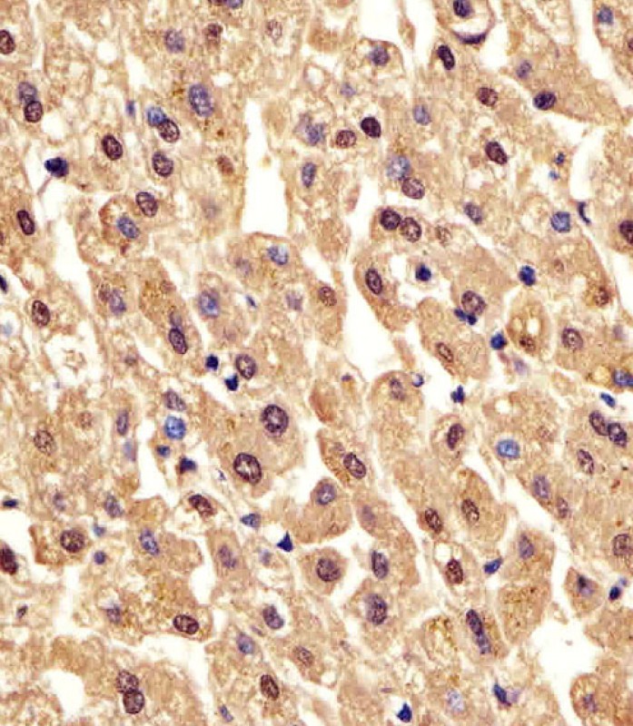 APR09092G staining PGM1 in human liver tissue sections by Immunohistochemistry (IHC-P - paraformaldehyde-fixed, paraffin-embedded sections). Tissue was fixed with formaldehyde and blocked with 3% BSA for 0. 5 hour at room temperature; antigen retrieval was by heat mediation with a citrate buffer (pH6). Samples were incubated with primary antibody (1/25) for 1 hours at 37°C. A undiluted biotinylated goat polyvalent antibody was used as the secondary antibody.