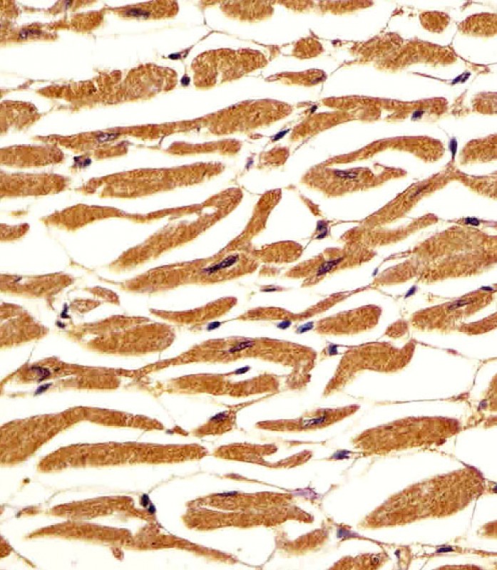 APR09092G staining PGM1 in human heart tissue sections by Immunohistochemistry (IHC-P - paraformaldehyde-fixed, paraffin-embedded sections). Tissue was fixed with formaldehyde and blocked with 3% BSA for 0. 5 hour at room temperature; antigen retrieval was by heat mediation with a citrate buffer (pH6). Samples were incubated with primary antibody (1/25) for 1 hours at 37°C. A undiluted biotinylated goat polyvalent antibody was used as the secondary antibody. |