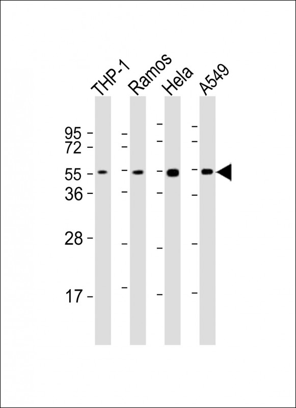All lanes : Anti-MAP2K7 Antibody (C-Term) at 1:2000 dilution Lane 1: THP-1 whole cell lysates Lane 2: Ramos whole cell lysates Lane 3: Hela whole cell lysates Lane 4: A549 whole cell lysates Lysates/proteins at 20 μg per lane. Secondary Goat Anti-Rabbit IgG, (H+L), Peroxidase conjugated at 1/10000 dilution. Predicted band size : 47 kDa Blocking/Dilution buffer: 5% NFDM/TBST. |