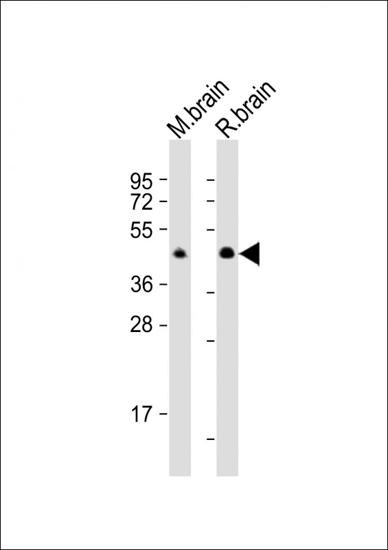 All lanes : Anti-CNP Antibody (C-Term) at 1:2000 dilution Lane 1: mouse brain lysates Lane 2: rat brain lysates Lysates/proteins at 20 μg per lane. Secondary Goat Anti-Rabbit IgG, (H+L), Peroxidase conjugated at 1/10000 dilution. Predicted band size : 48 kDa Blocking/Dilution buffer: 5% NFDM/TBST.