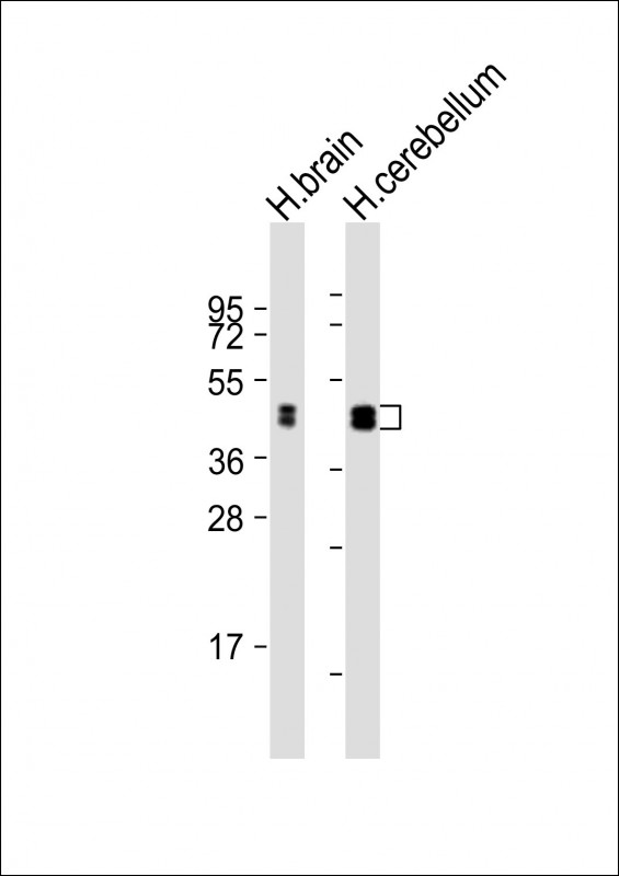 All lanes : Anti-CNP Antibody (C-Term) at 1:2000 dilution Lane 1: human brain lysates Lane 2: human cerebellum lysates Lysates/proteins at 20 μg per lane. Secondary Goat Anti-Rabbit IgG, (H+L), Peroxidase conjugated at 1/10000 dilution. Predicted band size : 48 kDa Blocking/Dilution buffer: 5% NFDM/TBST. |