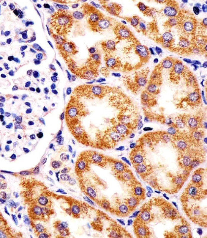 APR10595G staining TST in human kidney tissue sections by Immunohistochemistry (IHC-P - paraformaldehyde-fixed, paraffin-embedded sections). Tissue was fixed with formaldehyde and blocked with 3% BSA for 0. 5 hour at room temperature; antigen retrieval was by heat mediation with a citrate buffer (pH6). Samples were incubated with primary antibody (1/25) for 1 hours at 37°C. A undiluted biotinylated goat polyvalent antibody was used as the secondary antibody.