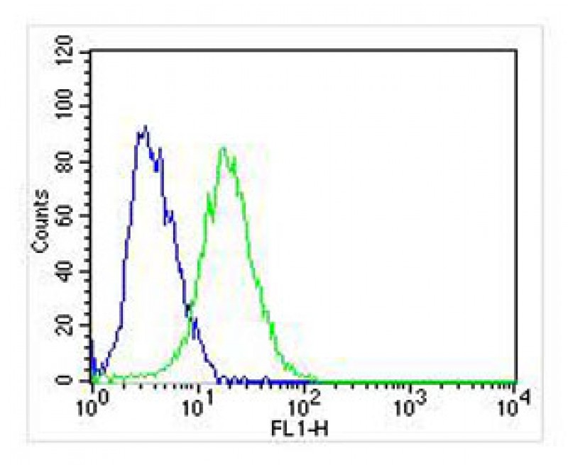 Overlay histogram showing SH-SY5Y cells stained with AMM06685G (green line). The cells were fixed with 2% paraformaldehyde (10 min). The cells were then icubated in 2% bovine serum albumin to block non-specific protein-protein interactions followed by the antibody (AMM06685G, 1:25 dilution) for 60 min at 37?C. The secondary antibody used was Goat-Anti-Rabbit IgG, DyLight? 488 Conjugated Highly Cross-Adsorbed(OH191631) at 1/400 dilution for 40 min at 37?C. Isotype control antibody (blue line) was rabbit IgG (1μg/1x10^6 cells) used under the same conditions. Acquisition of >10, 000 events was performed.