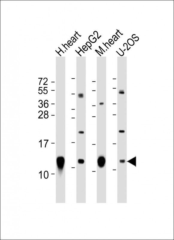 All lanes : Anti-COX6C Antibody (C-Term) at 1:2000 dilution Lane 1: human heart lysate Lane 2: HepG2 whole cell lysate Lane 3: mouse heart lysate Lane 4: U-2OS whole cell lysate Lysates/proteins at 20 μg per lane. Secondary Goat Anti-Rabbit IgG, (H+L), Peroxidase conjugated at 1/10000 dilution. Predicted band size : 11 kDa Blocking/Dilution buffer: 5% NFDM/TBST. |