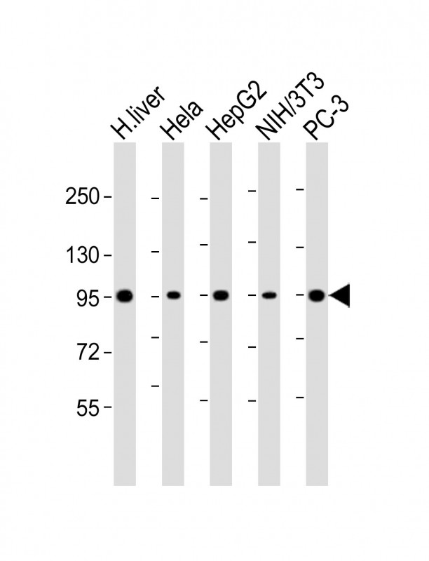 All lanes : Anti-PYGL Antibody (C-Term) at 1:2000 dilution Lane 1: human liver lysate Lane 2: Hela whole cell lysate Lane 3: HepG2 whole cell lysate Lane 4: NIH/3T3 whole cell lysate Lane 5: PC-3 whole cell lysate Lysates/proteins at 20 μg per lane. Secondary Goat Anti-Rabbit IgG, (H+L), Peroxidase conjugated at 1/10000 dilution. Predicted band size : 97 kDa Blocking/Dilution buffer: 5% NFDM/TBST. |