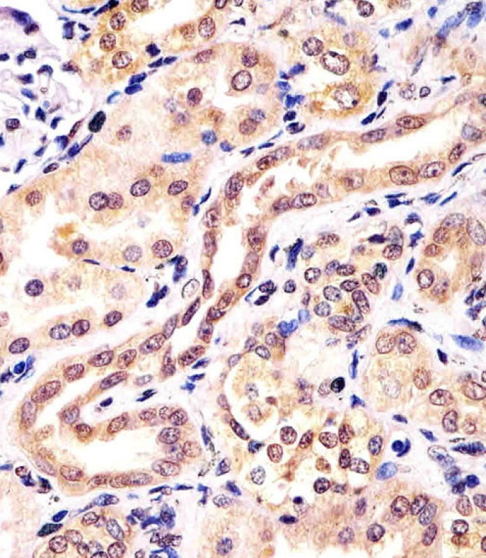 AMM06173G staining KCTD11 in human kidney tissue sections by Immunohistochemistry (IHC-P - paraformaldehyde-fixed, paraffin-embedded sections). Tissue was fixed with formaldehyde and blocked with 3% BSA for 0. 5 hour at room temperature; antigen retrieval was by heat mediation with a citrate buffer (pH6). Samples were incubated with primary antibody (1/25) for 1 hours at 37°C. A undiluted biotinylated goat polyvalent antibody was used as the secondary antibody.