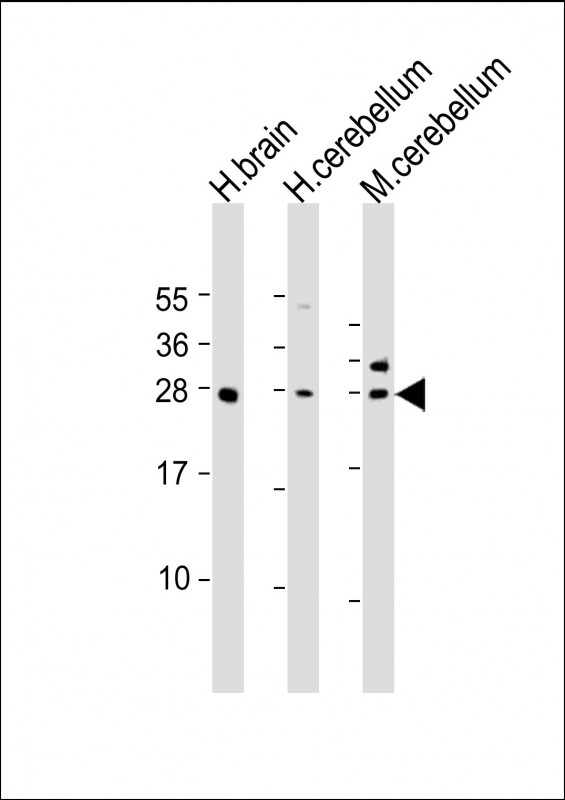 All lanes : Anti-KCTD11 Antibody (N-Term) at 1:1000-1:2000 dilution Lane 1: human brain lysate Lane 2: human cerebellum lysate Lane 3: mouse cerebellum lysate Lysates/proteins at 20 μg per lane. Secondary Goat Anti-Rabbit IgG, (H+L), Peroxidase conjugated at 1/10000 dilution. Predicted band size : 26 kDa Blocking/Dilution buffer: 5% NFDM/TBST. |