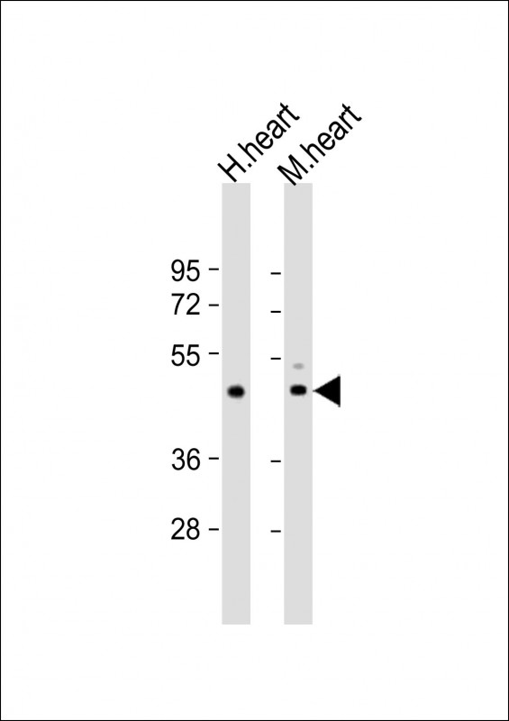 All lanes : Anti-TPRA1 Antibody (N-Term) at 1:2000 dilution Lane 1: human heart lysate Lane 2: mouse heart lysate Lysates/proteins at 20 μg per lane. Secondary Goat Anti-Rabbit IgG, (H+L), Peroxidase conjugated at 1/10000 dilution. Predicted band size : 41 kDa Blocking/Dilution buffer: 5% NFDM/TBST. |