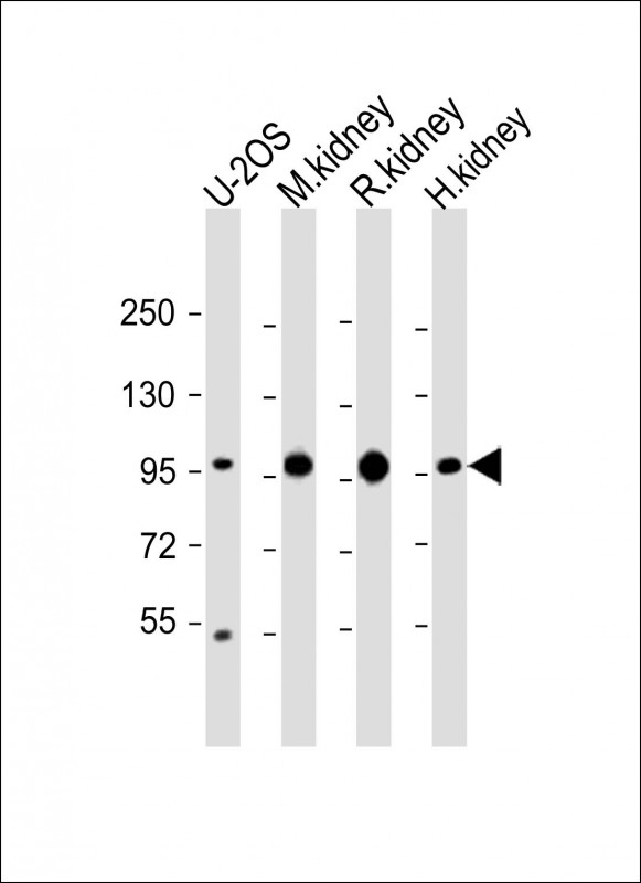 All lanes : Anti-ACO1 Antibody (N-Term) at 1:2000 dilution Lane 1: U-2OS whole cell lysate Lane 2: mouse kidney lysate Lane 3: rat kidney lysate Lane 4: human kidney lysate Lysates/proteins at 20 μg per lane. Secondary Goat Anti-Rabbit IgG, (H+L), Peroxidase conjugated at 1/10000 dilution. Predicted band size : 98 kDa Blocking/Dilution buffer: 5% NFDM/TBST. |