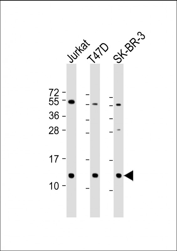 All lanes : Anti-TFF1 Antibody (Center) at 1:2000 dilution Lane 1: Jurkat whole cell lysate Lane 2: T47D whole cell lysate Lane 3: SK-BR-3 whole cell lysate Lysates/proteins at 20 μg per lane. Secondary Goat Anti-Rabbit IgG, (H+L), Peroxidase conjugated at 1/10000 dilution. Predicted band size : 9 kDa Blocking/Dilution buffer: 5% NFDM/TBST. |