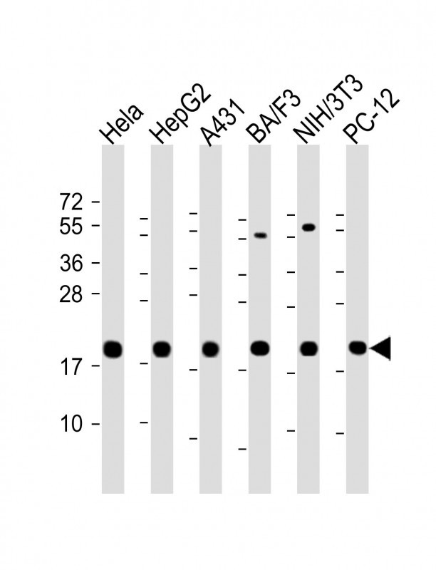 All lanes : Anti-Cyclophilin B Antibody at 1:2000 dilution Lane 1: Hela whole cell lysate Lane 2: HepG2 whole cell lysate Lane 3: A431 whole cell lysate Lane 4: BA/F3 whole cell lysate Lane 5: NIH/3T3 whole cell lysate lane 6: PC-12 whole cell lysate Lysates/proteins at 20 μg per lane. Secondary Goat Anti-Rabbit IgG, (H+L), Peroxidase conjugated at 1/10000 dilution. Predicted band size : 24 kDa Blocking/Dilution buffer: 5% NFDM/TBST.