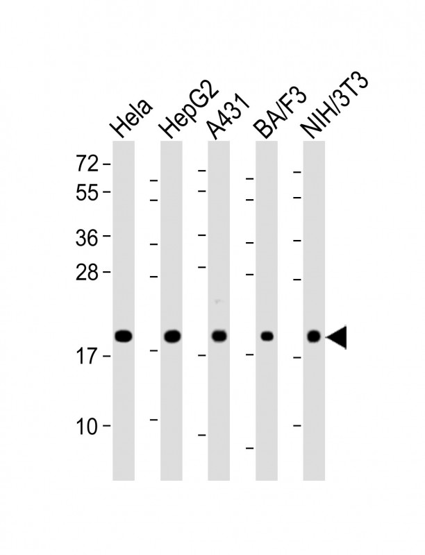 All lanes : Anti-Cyclophilin B Antibody at 1:2000 dilution Lane 1: Hela whole cell lysate Lane 2: HepG2 whole cell lysate Lane 3: A431 whole cell lysate Lane 4: BA/F3 whole cell lysate Lane 5: NIH/3T3 whole cell lysate Lysates/proteins at 20 μg per lane. Secondary Goat Anti-Rabbit IgG, (H+L), Peroxidase conjugated at 1/10000 dilution. Predicted band size : 24 kDa Blocking/Dilution buffer: 5% NFDM/TBST. |