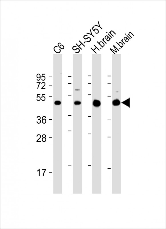 All lanes : Anti-SLC2A3 Antibody (C-Term) at 1:2000 dilution Lane 1: C6 whole cell lysate Lane 2: SH-SY5Y whole cell lysate Lane 3: human brain lysate Lane 4: mouse brain lysate Lysates/proteins at 20 μg per lane. Secondary Goat Anti-Rabbit IgG, (H+L), Peroxidase conjugated at 1/10000 dilution. Predicted band size : 54 kDa Blocking/Dilution buffer: 5% NFDM/TBST. |