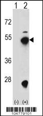 Western blot analysis of FDPS (arrow) using rabbit polyclonal FDPS Antibody (D31) (Cat. AMM04521G). 293 cell lysates (2 ug/lane) either nontransfected (Lane 1) or transiently transfected (Lane 2) with the FDPS gene. |
