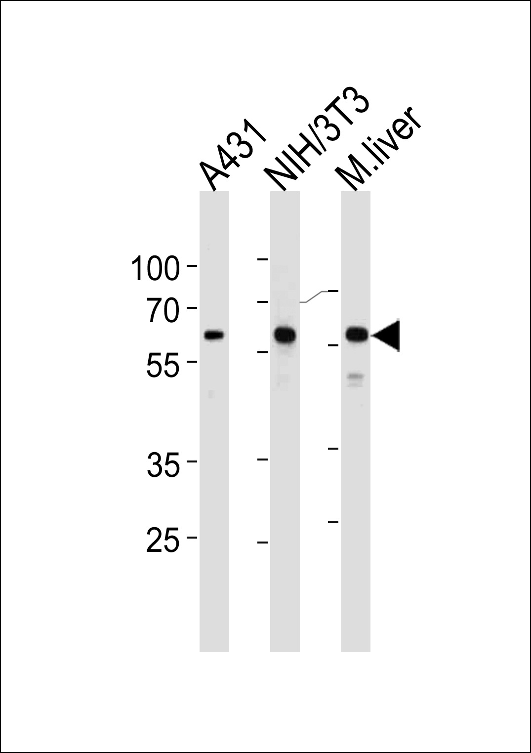 HSPD1 Antibody (C-term) (Cat. APR16777G) western blot analysis in A431,mouse NIH/3T3 cell line and mouse liver tissue lysates (35ug/lane).This demonstrates the HSPD1 antibody detected the HSPD1 protein (arrow).