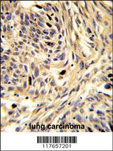 Formalin-fixed and paraffin-embedded human lung carcinoma reacted with HSPD1 Antibody (C-term), which was peroxidase-conjugated to the secondary antibody, followed by DAB staining. This data demonstrates the use of this antibody for immunohistochemistry; clinical relevance has not been evaluated.