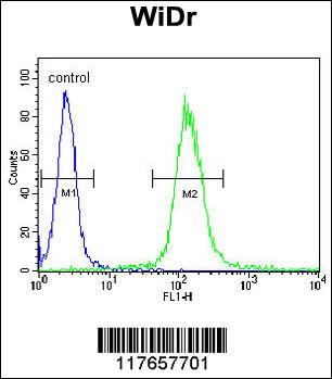 HSPD1 Antibody (C-term) (Cat. APR16777G) flow cytometric analysis of WiDr cells (right histogram) compared to a negative control cell (left histogram).FITC-conjugated goat-anti-rabbit secondary antibodies were used for the analysis. |
