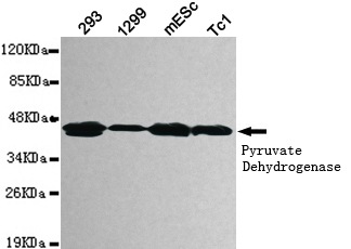 Western blot detection of pyruvate dehydrogenase (lipoamide) alpha 1 in 293,1299,mEsc and Tc1 cell lysates using pyruvate dehydrogenase (lipoamide) alpha 1 mouse mAb (1:1000 diluted).Predicted band size: 43KDa.Observed band size: 43KDa.