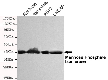 Western blot detection of Mannose Phosphate Isomerase in Rat kidney,Rat brain,A549 and Lncap cell lysates and using Mannose Phosphate Isomerase mouse mAb (1:1000 diluted).Predicted band size: 54KDa.Observed band size: 45KDa.