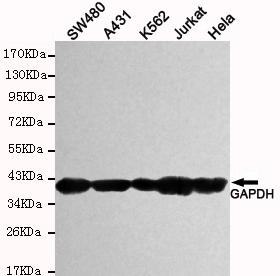 Western blot detection of GAPDH(human specific) in SW480,A431,K562,Jurkat and Hela cell lysates using GAPDH(human specific) mouse mAb (1:5000 diluted). Predicted band size:37KDa.Observed band size:37KDa. |