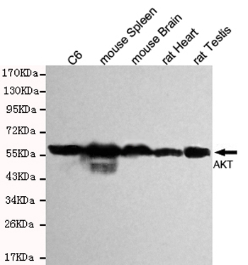 Western blot detection of total AKT in rat heart,rat testis,mouse brain,mouse spleen and C6 cell lysates and using AKT(pan) mouse mAb (1:1000 diluted).Predicted band size: 60KDa.Observed band size: 60KDa. |